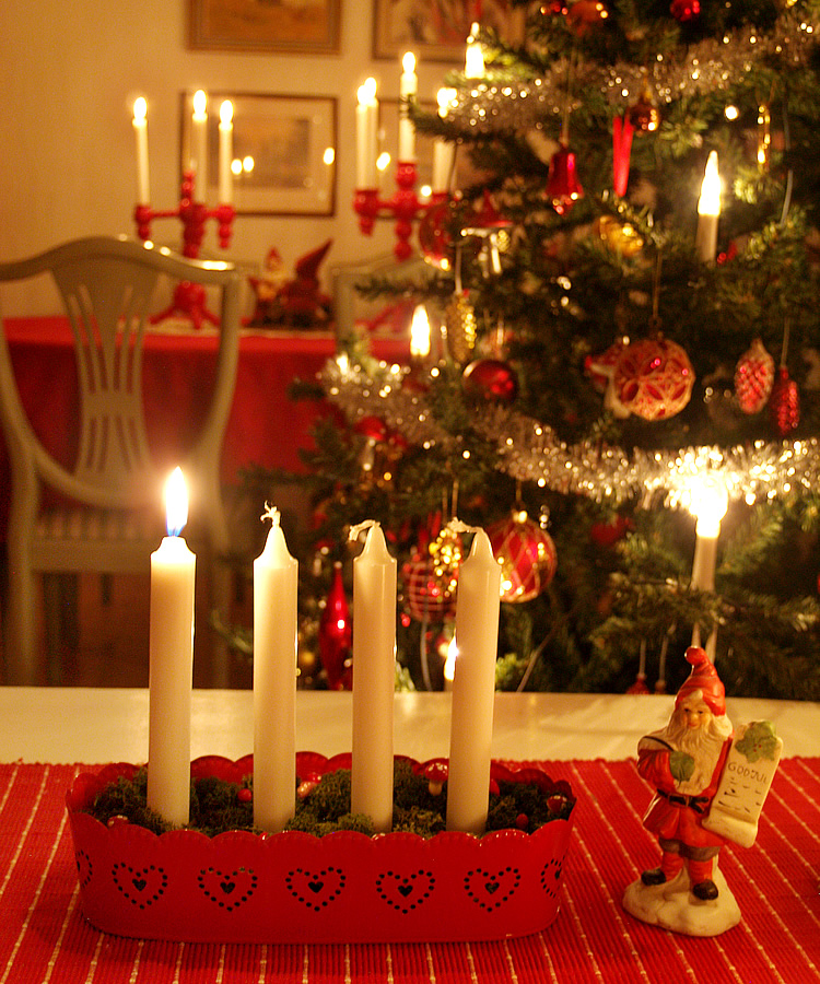 Så har advent äntligen kommit till mitt lilla julpyntade hem. Jag satt nyss och myste med en lussekatt i skenet av det första tända ljuset och kände hur jag riktigt fylldes av julstämning och förväntan på allt härligt som nu stundar under december månad. Tänkt att vi äntligen är här nu vid årets bästa tid. Jag blev till slut färdig med julgranen igår, och kunde sedan äntligen städa undan alla kartonger och lägga på den sista julduken på matbordet och ställa dit mina flerarmade kulljusstakar. Bilder på allt julpynt kommer givetvis här på bloggen inom kort. Jag brukar föredra att ha längre antikljus i min adventsljusstake, men de var tyvärr slut så det fick bli kronljus den här gången. Det går ju det också, så länge det är klassiska smala ljus är jag nöjd.