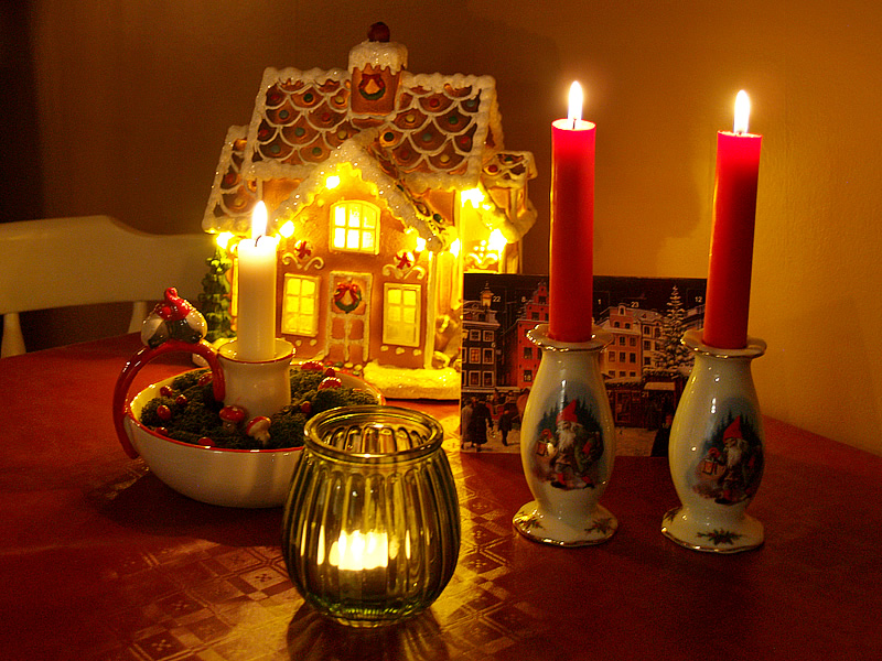 Närbild på mitt fina pepparkakshus som jag fick i julklapp av föräldrarna för ett par år sedan. Dock behövde vi åka och byta den första jag fick då den hade ett hål rakt igenom botten, men lyckligtvis hittade vi till slut en likadan som var hel efter att vi letat runt halva stan. Den söta runda ljusstaken med mossa i hade jag från början datumljus i för en kanske tio år sedan, men eftersom jag är ganska dålig på att komma ihåg att tända varje dag så har jag de senaste åren bara haft ett vanligt ljus i den i stället. Det går ju bra det också.