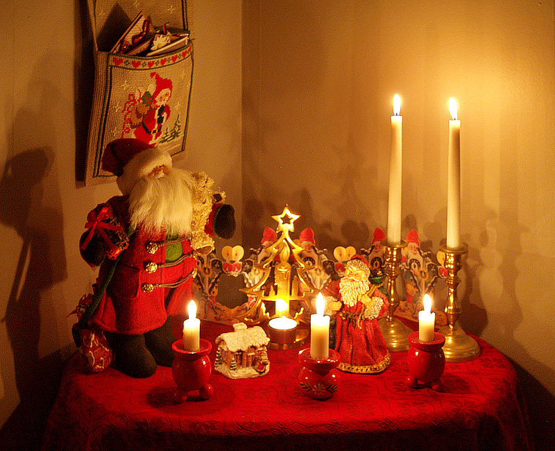 Nu njuter jag för fulla muggar vill jag lova, så här mitt i julpyntandets dagar. Sakta men säkert har julen vuxit fram i de olika rummen, och kartong efter kartong har tömts. Nu är det egentligen bara julgranen kvar som ska pyntas. Jag har tagit fram den och stoppat ner den i foten, och där är vi nu ungefär. Nästa steg blir att försöka fluffa till den någorlunda och sätta i lampor, och sedan givetvis själva pyntandet. Tanken är att den ska bli klar till första advent i alla fall. Jag väntar med att fota vardagsrummet tills att den är klar, men tänkte bjuda på ett par andra pyntbilder under tiden. Först ut är ännu en bild på köket mitt, men nu med tända ljus.