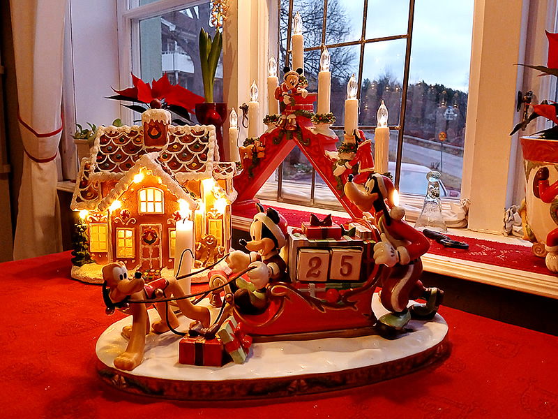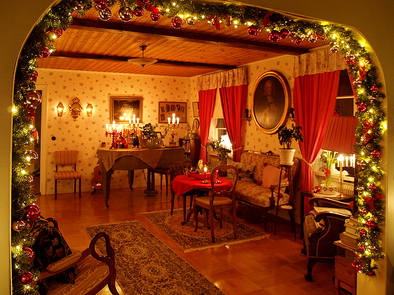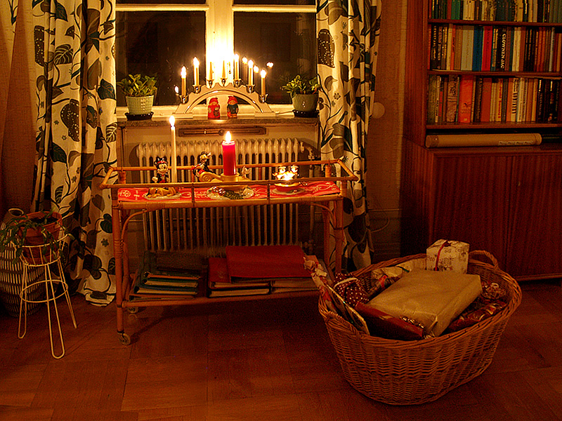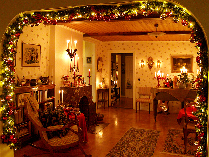 En sista vy mot öppna spisen, gottebordet och flygeln. Jag kan aldrig få nog av min kära ljusgirlang. Den har tjugotre år på nacken nu, och är tudelad. Belysningen har fått bytas ut flera gånger, dock kom den med alla kulor och rosetter redan på plats. Den köptes på Ellos då år 2002 (när de fortfarande körde med klassiskt pynt och inte så genomtrendigt som nu), tillsammans med en matchande dörrkrans och bordsgran.