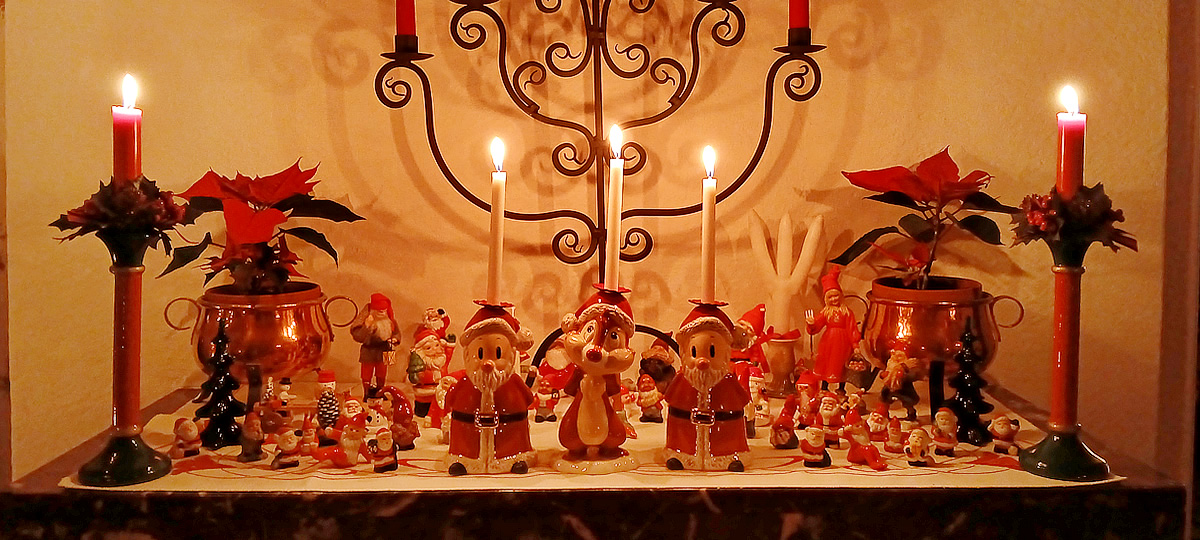 Till sist en närbild på alla småtomtarna på öppna spisen. Mamma kunde inte låta bli i juldagarna och beställde Puff och de två tomtarna från Fyrklövern, som givetvis fick hedersplatsen. Vi brukar skoja om att Fyrklövern är som vår familjs hovleverantör för att vi har köpt så mycket fint hos dem genom åren.