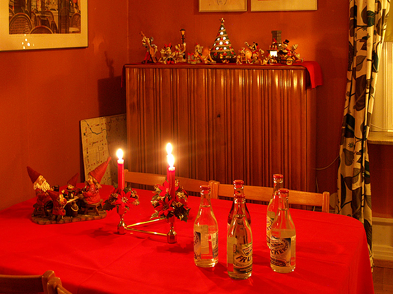 Till julklappsöppningen brukar vi traditionsenligt alltid dricka klassiska läskedrycker på glasflaska. Ni vet, sockerdricka, fruktsoda och liknande. Jag vet inte varför det blev just det, men så har det varit så länge jag kan minnas och därför vill man ju fortsätta med det. Det är alla sådana små traditioner som gör julen för mig. Tomtefamiljen på bordet har för övrigt fått flytta hem till mig nu, som jag skrev om tidigare.