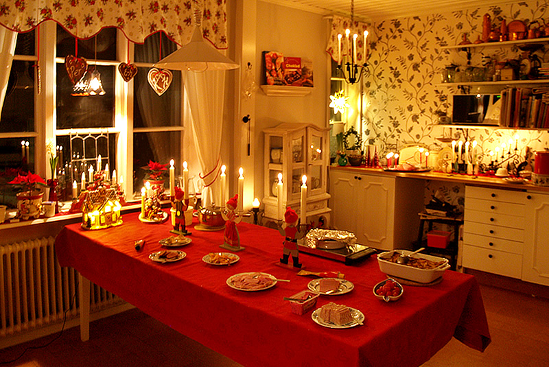 Det gäller att vara snabb om jag vill få till en bild på julbordet i köket. När jag fotar ute i matrummet har jag mer tid till godo eftersom det görs medans julbordsrätterna håller på att fixas till och läggas upp, men när det väl är dags att fota i köket är ju således allting klart och den hungriga och lite smått otåliga familjen står och trampar i kulisserna redo med sina tallrikar. Därför blir det oftast bara en bild i köket. Inte lätt att vara fotograf.