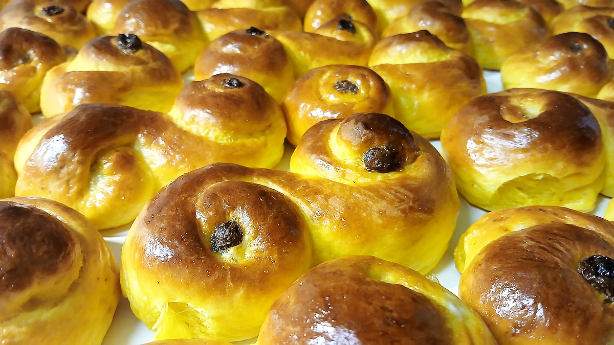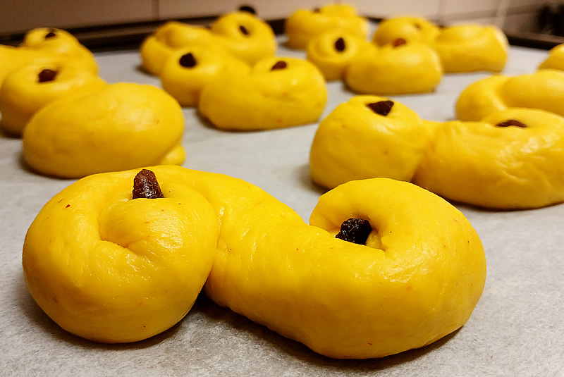 Det blev inget saffransbak förra helgen som jag hade planerat, men däremot blev det äntligen av i tisdags. Eftersom jag alltid använder färskjäst så hade jag ett nalkande bästföredatum som hjälpte mig att till slut få ändan ur vagnen. Det tar ju sina timmar att baka bullar, så det var väl det som gjorde att jag sköt på det i några dagar. Men så skönt att ha det gjort och nu är hela frysen full av lussekatter. Och mysigt var det ändå, trots slitet. Julmusiken gick varm medans jag bakade, och jag fick riktigt med julkänslor. Vi hade dessutom fått säsongens första snöflingor tidigare under dagen, vilket bidrog. Jag passade på att ta en bild innan bullarna hade penslats med ägg, eftersom efteråt ser de ju så slafsiga ut innan de har fått hamna i ugnen.