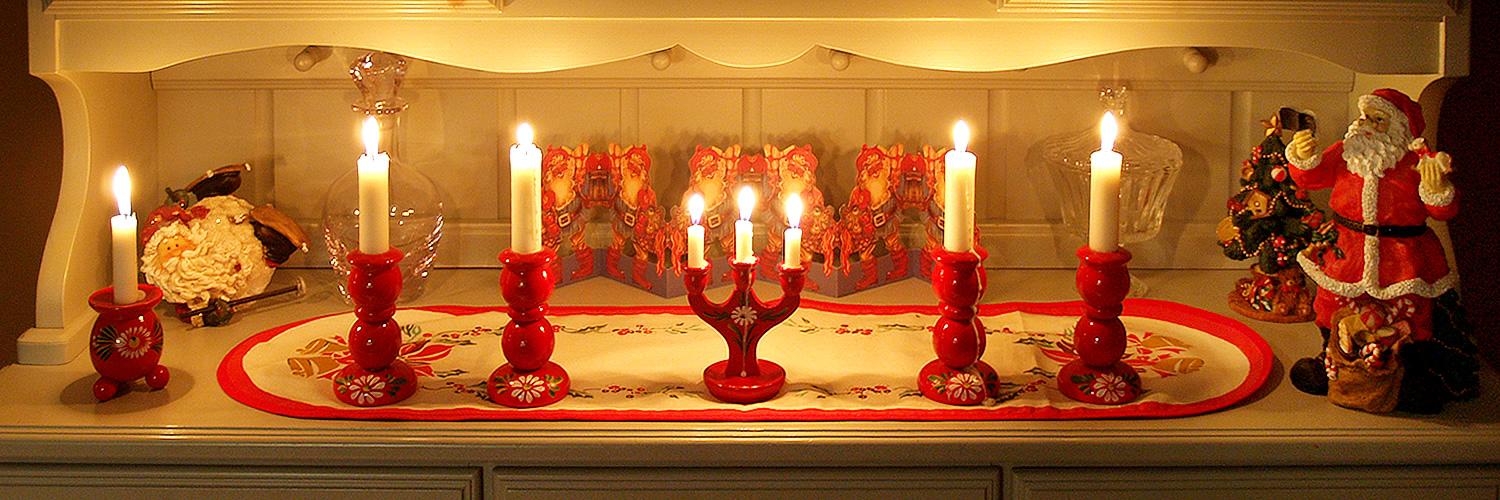 Tänkte att jag skulle bjuda på några närbilder på lite mer julpynt i mitt hem. Här på skåpet i köket ser vi ljusstakar som jag fick ärva från farmors dödsbo, julduk som mamma hittade åt mig på second hand, tomterad som jag fick av föräldrarna, samt tomtar och julgran som jag köpte för en sisådär tjugo år sedan. På den tiden var nytt julpynt inte bara för det mesta klassiskt i stilen utan också billigt. Den stora tomten kostade runt femtiolappen minns jag, och snöbollstomten och granen kostade under trettio kronor. Vilken skillnad!
