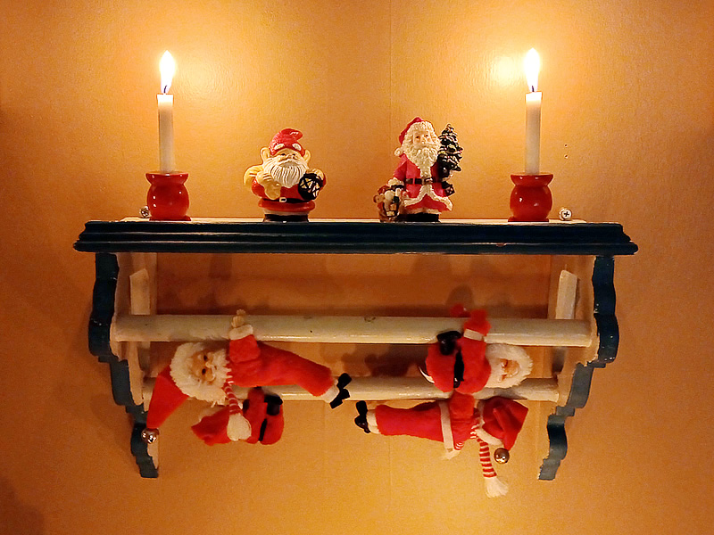 Min söta lilla second hand-hylla som sitter på väggen över köksbordet. Förra året hade jag bara två hängtomtar, men fick hit två stycken till i somras från föräldrarna, så nu är det ren tomtefest på hyllan.