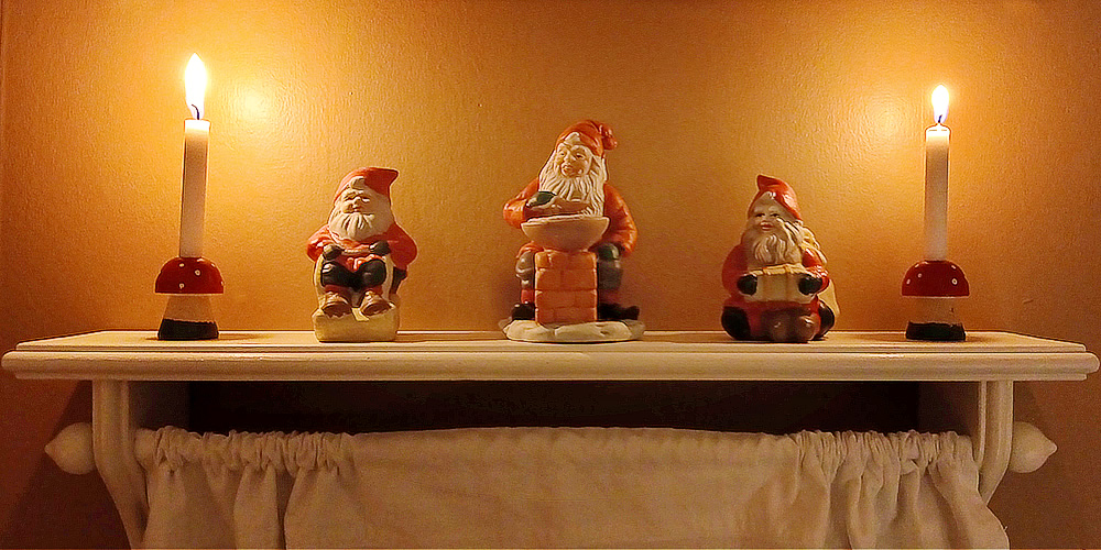Farfars tomtar som jag fick ärva efter hans dödsbo ovanpå min paradhylla i köket. Den var från början i furu när jag hittade den på second hand och utan fungerande handduksstång, men mamma målade den så fint i vitt åt mig och fixade både ny stång och nya knoppar som också målades. Älskar flugsvampsljusstakarna.